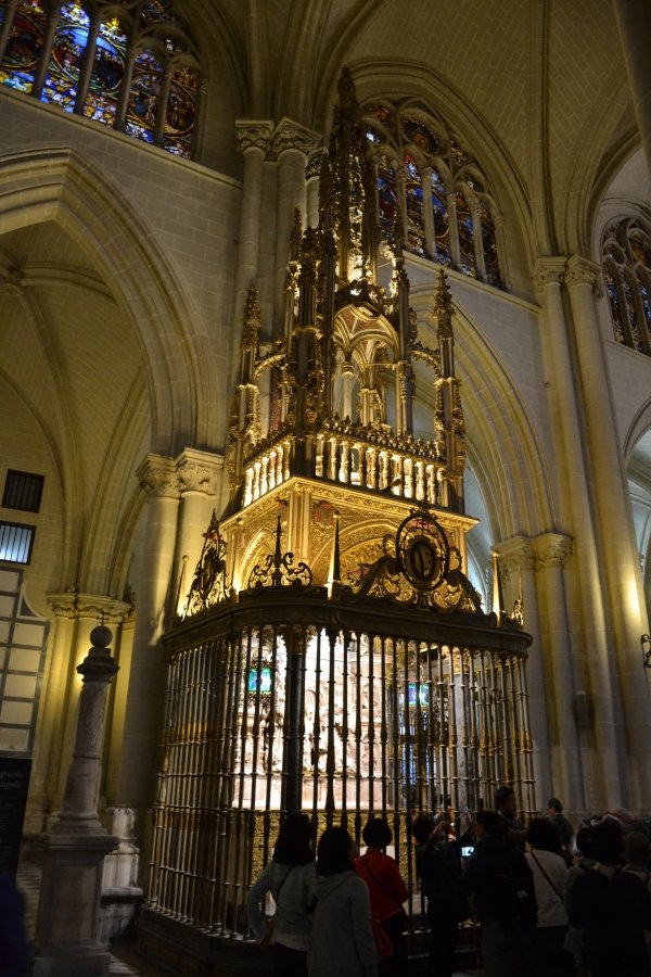 Toledská katedrála P. Marie, pětilodní bazilika bez příčné lodi se dvěma věžemi, dvojitým ochozem, systémem kaplí a velkým rajským dvorem je 120 m dlouhá a 59 m široká. Patří mezi nejcennější památky španělské gotiky, ovlivněné mudéjarskými vlivy. Byla založena roku 1226 a charakteristické západní průčelí bylo dokončeno po roce 1500. Vyřezávaný a zlacený hlavní oltář, který zabírá celou šířku hlavní lodi a výšku až k patkám klenby, je z roku 1504. Měli jsme placenou prohlídku s výkladem.
