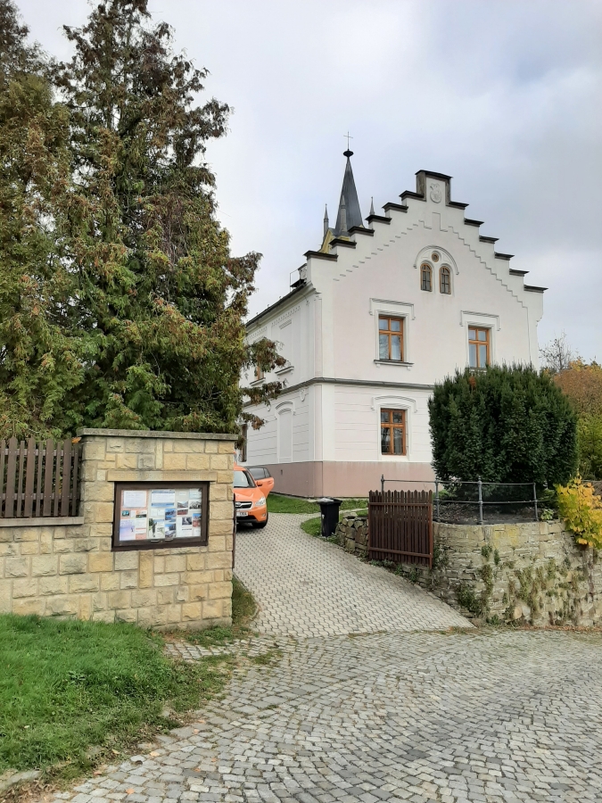 Museli jsme se pak ale z Trojáku vrátit přes Rajnochovice do údolí, kde je silnice na Valašské Meziříčí. Když už jsme byli v Rajnochovicích, zajeli jsme ke kostelu.