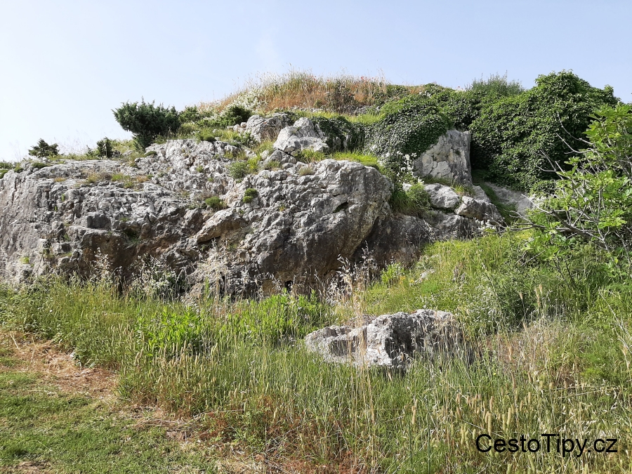 Kousek dál pak byl vrchol a když jsme na něj vystoupali, měli jsem pod sebou obrovský lom na kamennou vápencovou drť. No všude kolem dokola byla jen modrá hladina moře.