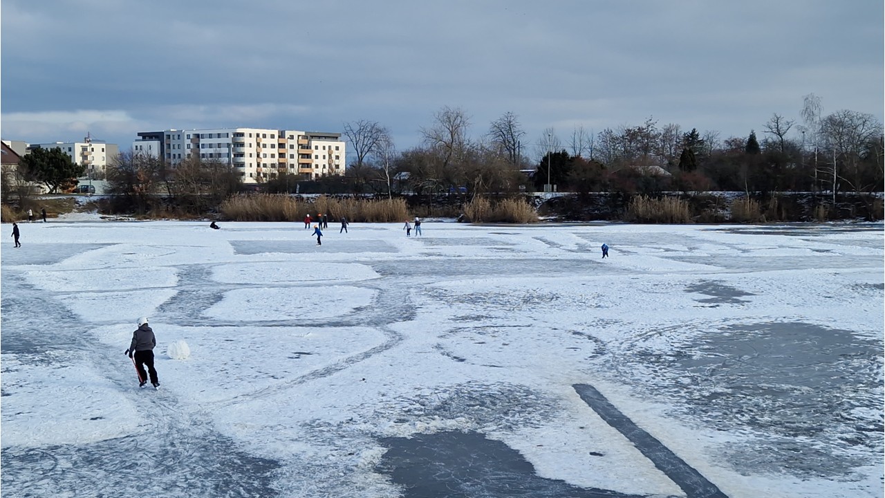 Také se mohlo bruslit jen kousek od domu na rybníku Hamrys. Tedy my jsme jen koukali jak ten náš vnuk to „válí“.